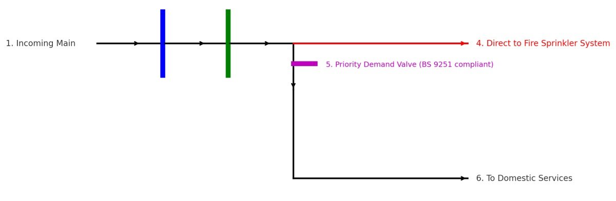 On sprinkler activation: PDV closes/restricts domestic line, prioritising sprinkler flow.